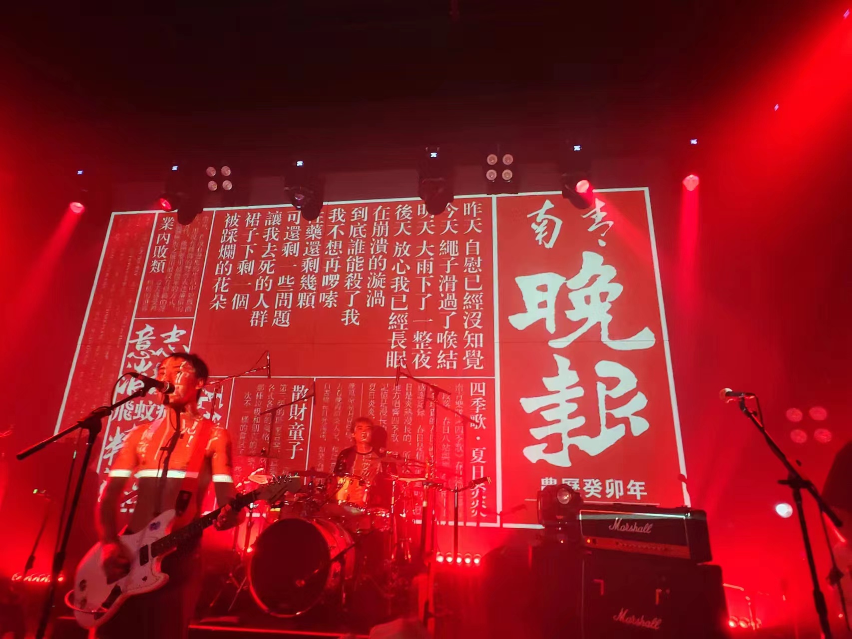 主唱bokai弹吉他,唱歌之余不时和台下的观众互动,他喝水台下观众起哄要喝他就递下去一边笑,用的麦克风是那种KTV里经常会看到的那种老式的大约有拳头大小那种,穿着也复古。
